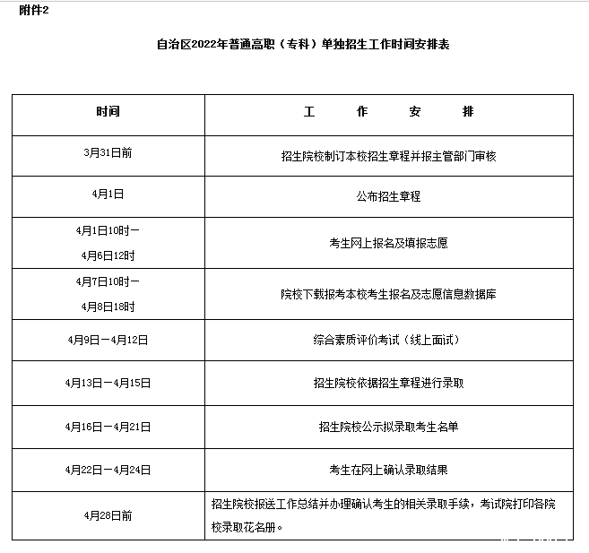 2.自治区2022年普通高职(专科)单独招生工作时间安排表