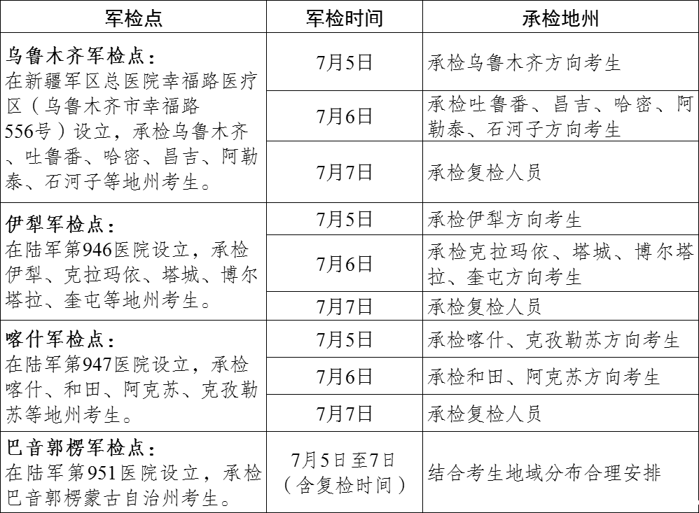 军检工作包括面试、体格检查2项内容,时间定于7月5日至7日进行(含复检时间),参检对象为总成绩不低于军检线且政治考核、体质测试成绩均合格的考生。